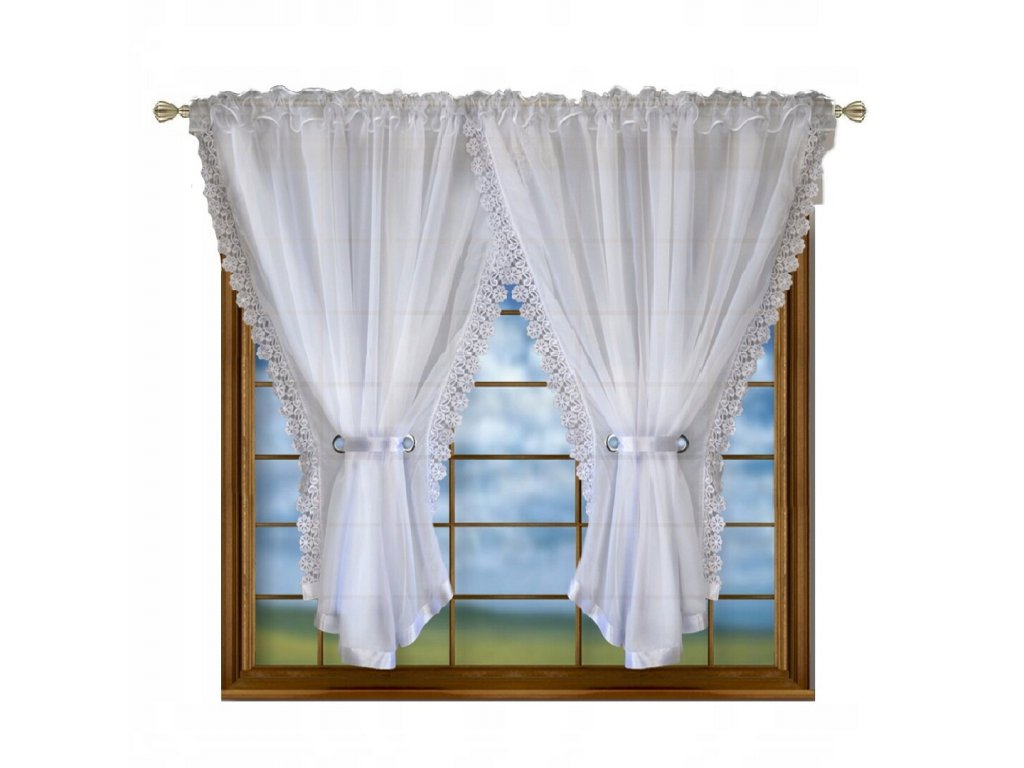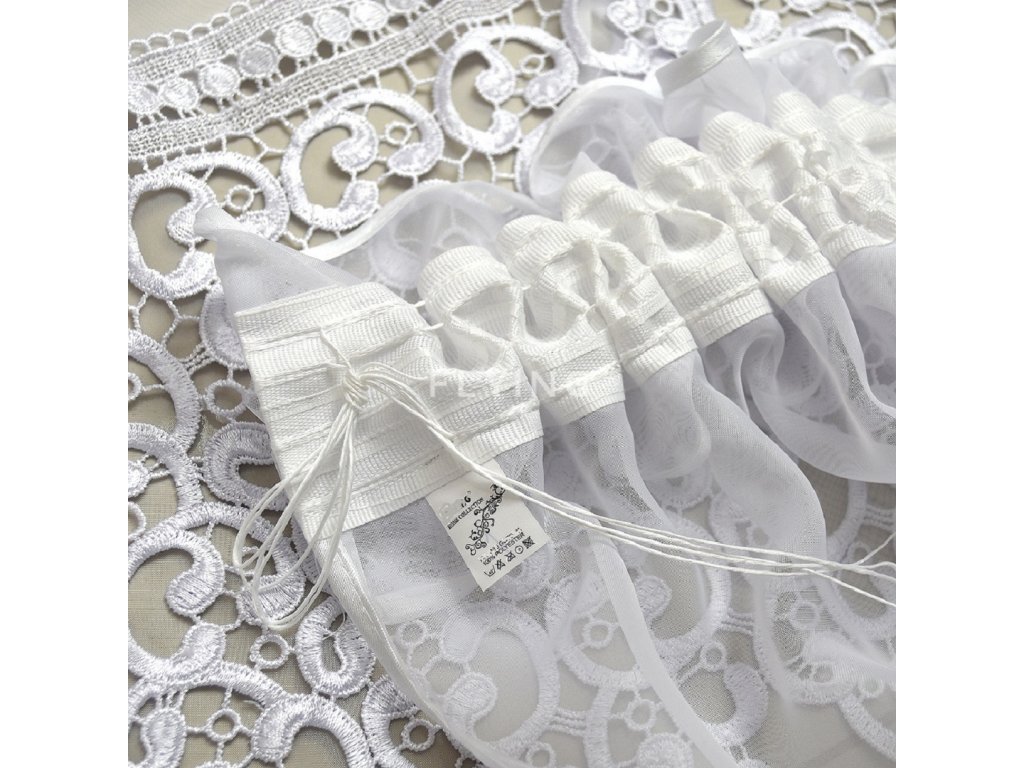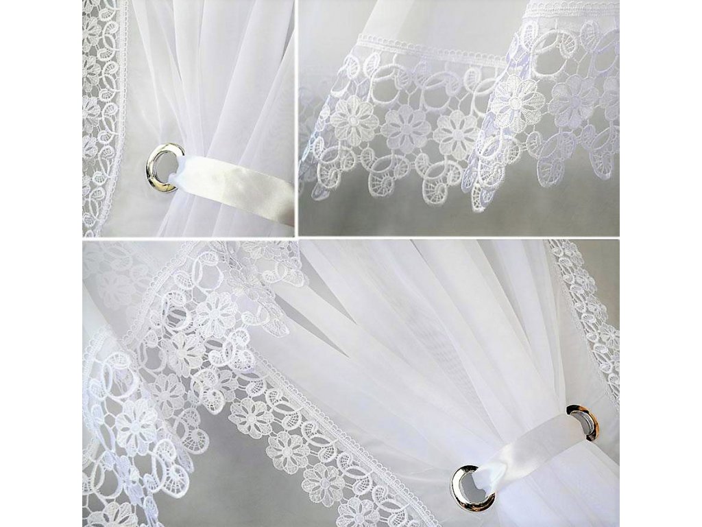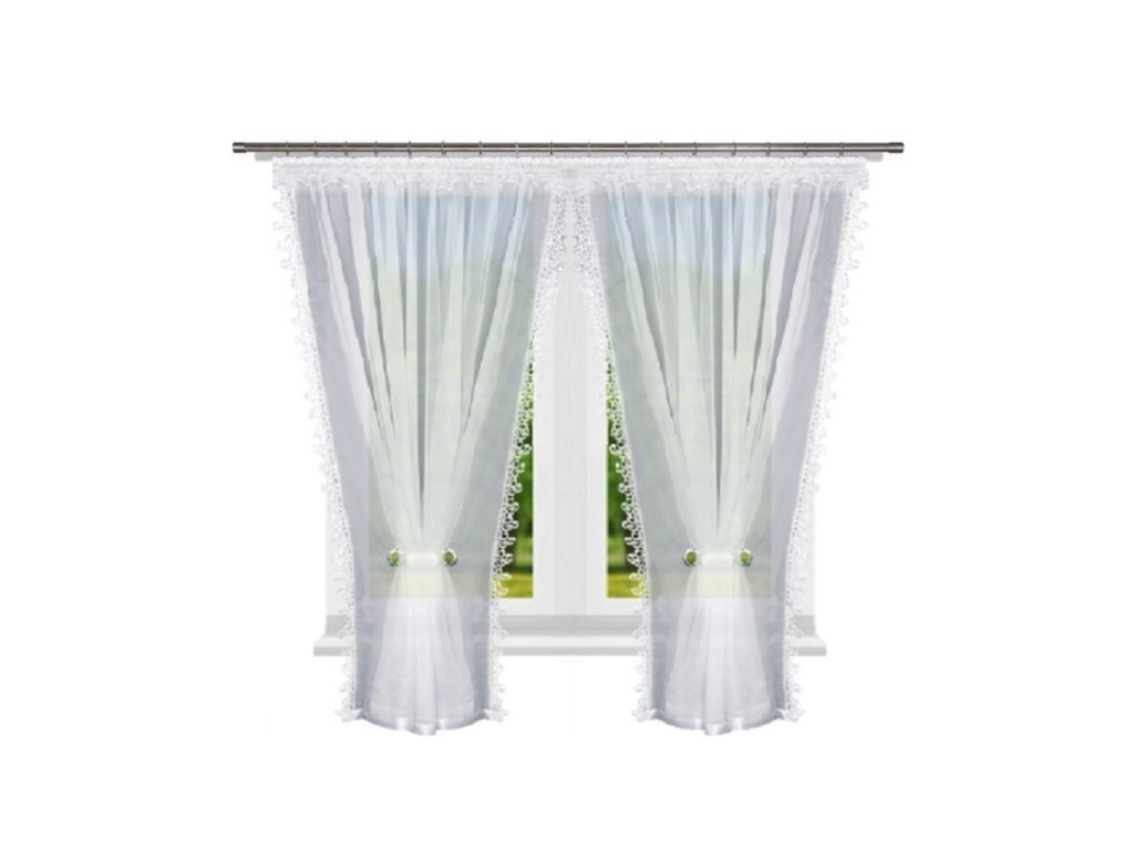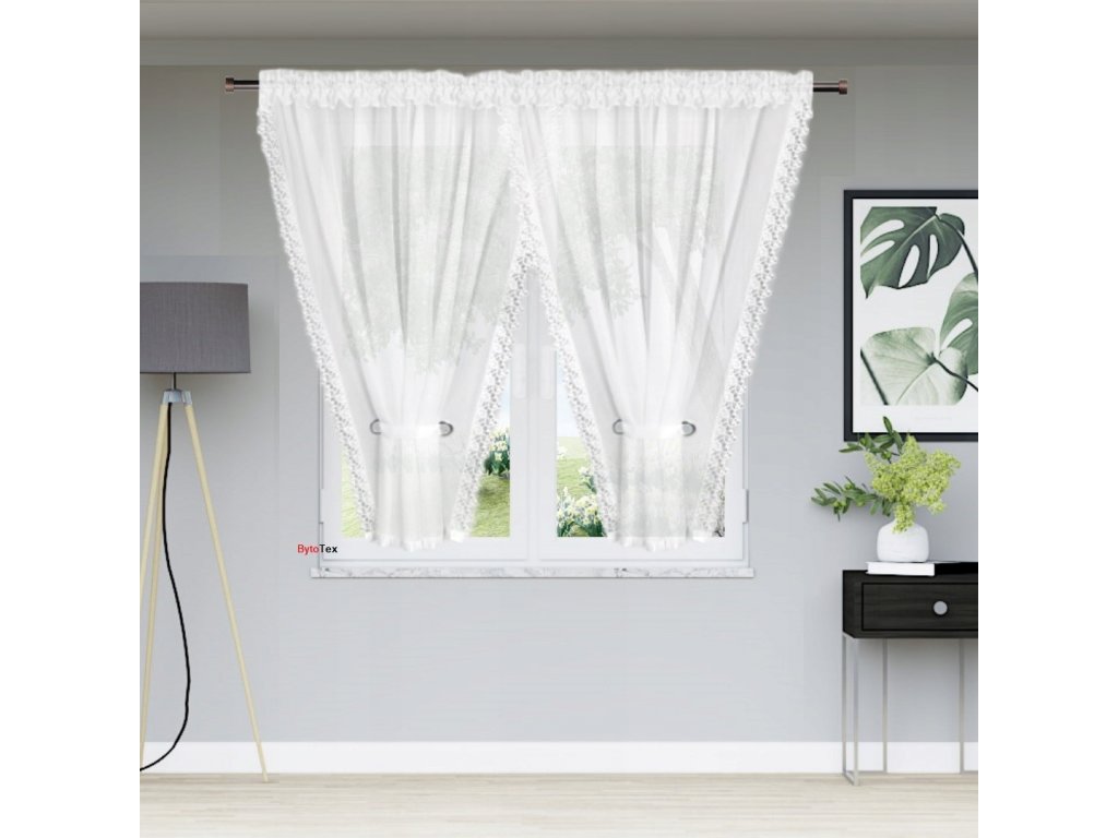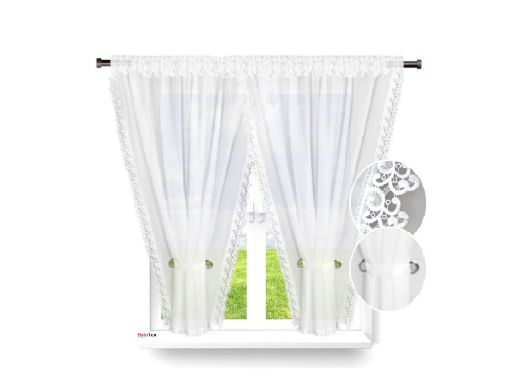 Hotová kusová záclona z hladkého průsvitného bílého voálu je ozdobená krásnou krajkou. Skládá se ze dvou dílů které jsou ušité na jedné řasící pasce, dily má dva otvory opatřené luversy cca 30cm, ktere snadno uchytíté sponou na suchý zíp. Krajka ne vždy odpovídá profilovému foto. Dá se nařasit.