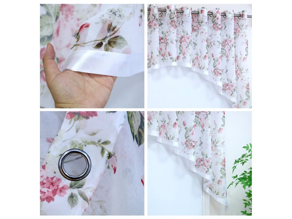 Dekorační krátká záclona s jemným květinovým vzorem, který se hodí k interiéru každého druhu. Díky klasickému obloukovému střihu záclona krásně splývá přes okno, zdůrazňuje jeho tvar a dodává místnosti nádech lehkosti. Je to perfektní volba do obývacího pokoje, jídelny, kuchyně nebo ložnice – kamkoli, kde chcete spojit funkčnost, styl a útulnou atmosféru.