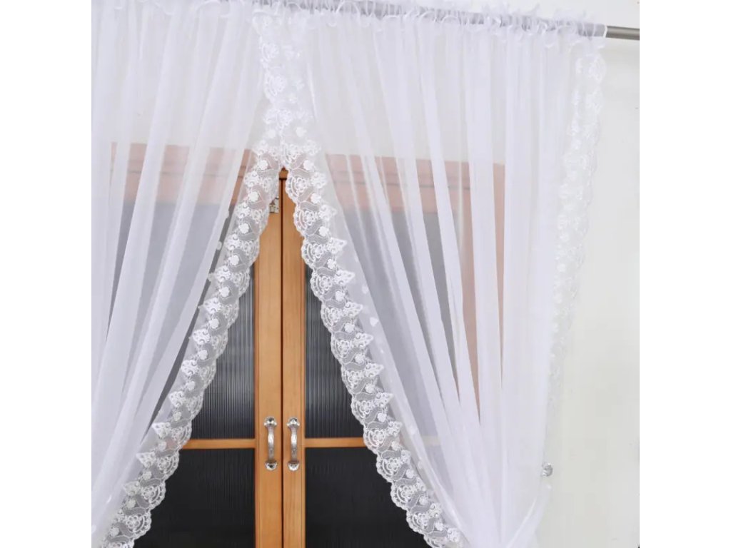 Hotová kusová záclona z hladkého průsvitného bílého voálu je ozdobená krásnou krajkou. Jeho rozměry jsou 400 × 155 cm. Nahoře je opatřena řasící stuhou díky které můžete měnit šířku záclony a tunýlkem na tyč o průměru 3,5 cm. Je též přizpůsobena k pověšení na háčky nebo žabky. Sada obsahuje dvě voálové stuhy pro uchycení záclon. Okraje záclony jsou zakončeny krásnou vyšívanou krajkou.