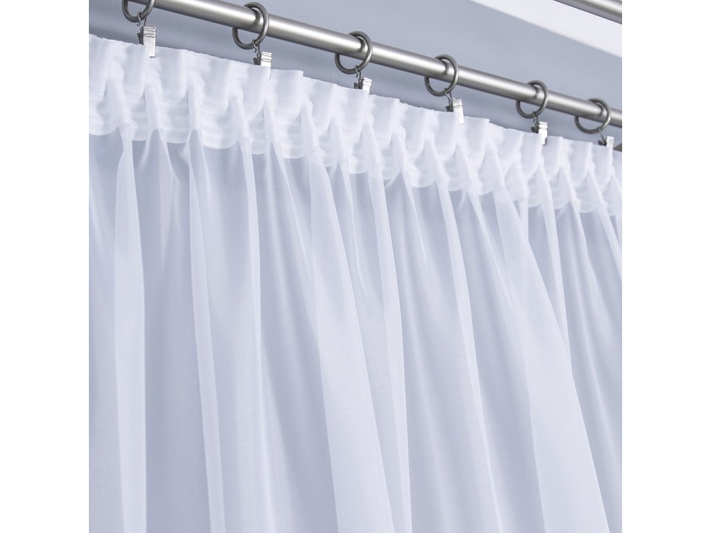 Hotová kusová záclona z hladkého průsvitného bílého voálu je ozdobená krásnou krajkou. Nahoře je opatřena řasící stuhou díky které můžete měnit šířku záclony a tunýlkem na tyč o průměru 3,5 cm. Je též přizpůsobena k pověšení na háčky nebo žabky. Krajka ne vždy odpovídá profilovému foto.