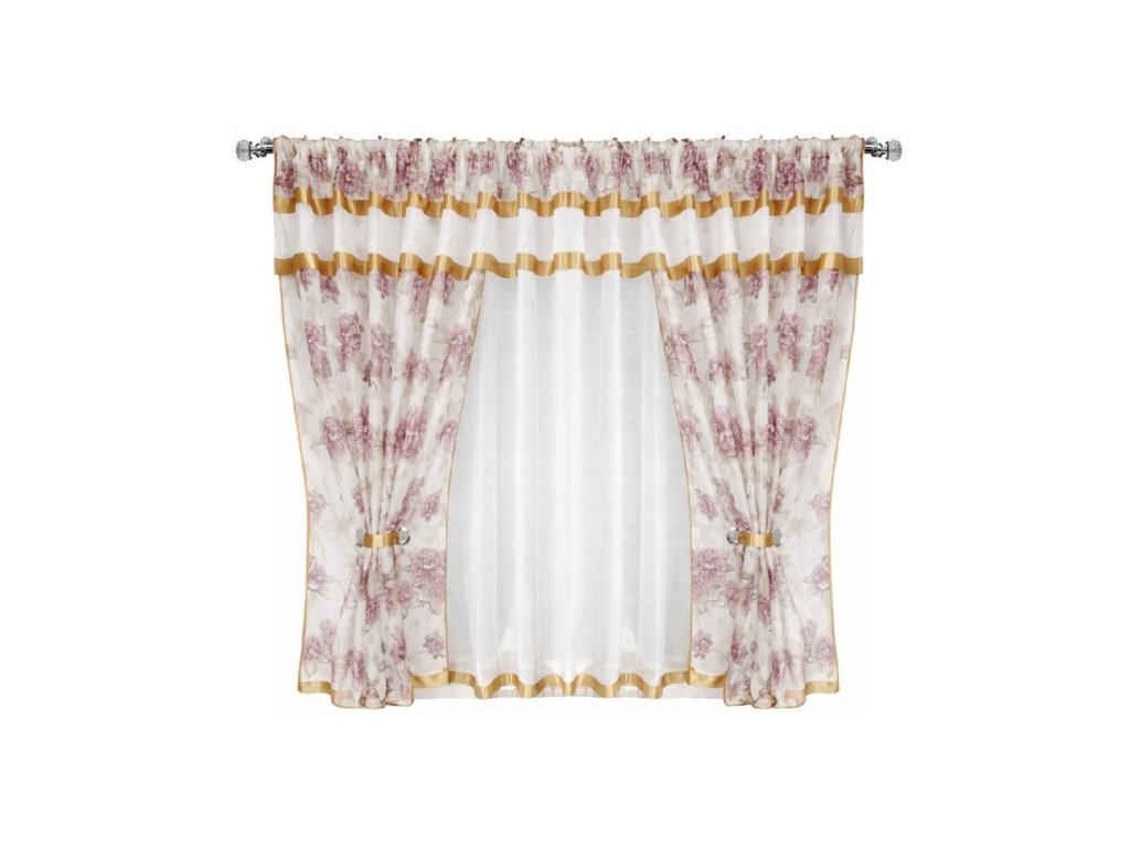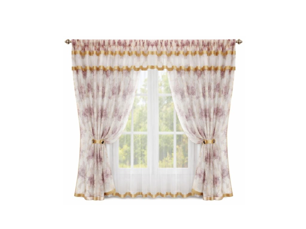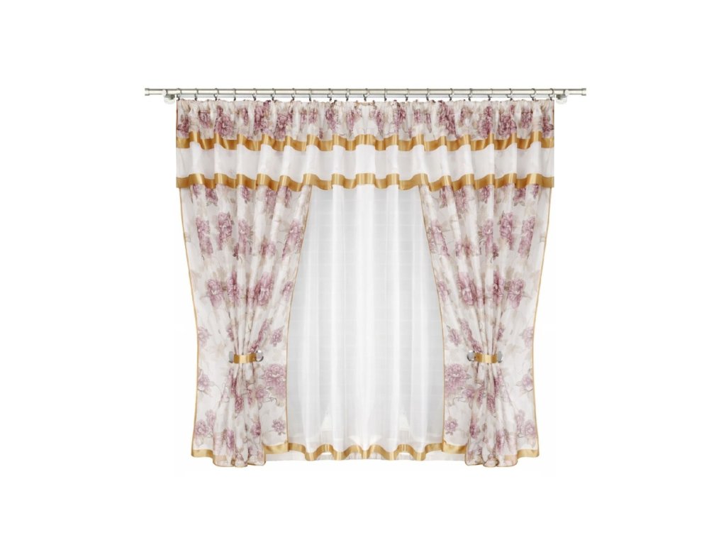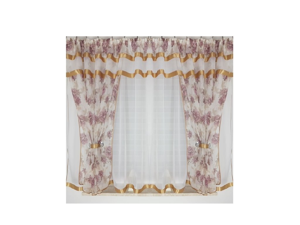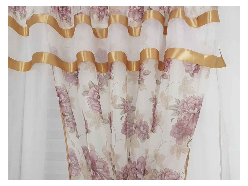 Nádherná hotová kusová záclona s květinamy. Záclona je po okraji ozdobená lesklou lemovkou. Na horním okraji je našitá řasící pásce, pomocí které můžete upravovat šířku záclony a tunýlkem na tyč o průměru 3,5 cm.