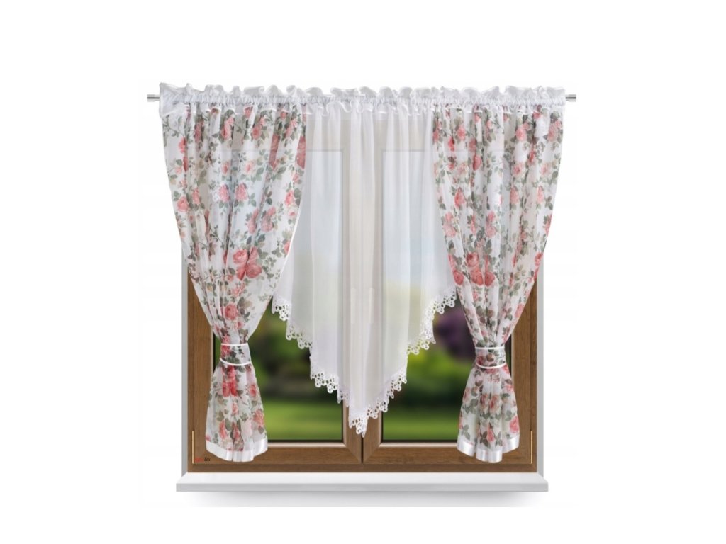 Nádherná hotová kusová záclona s květinamy. Záclona je po okraji ozdobená lesklou lemovkou. Na horním okraji je našitá řasící pásce, pomocí které můžete upravovat šířku záclony a tunýlkem na tyč o průměru 3,5 cm.