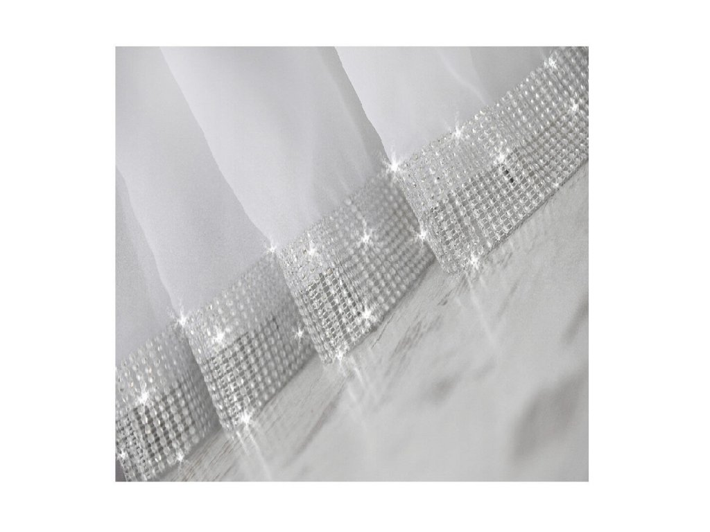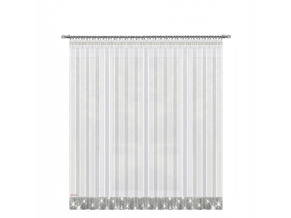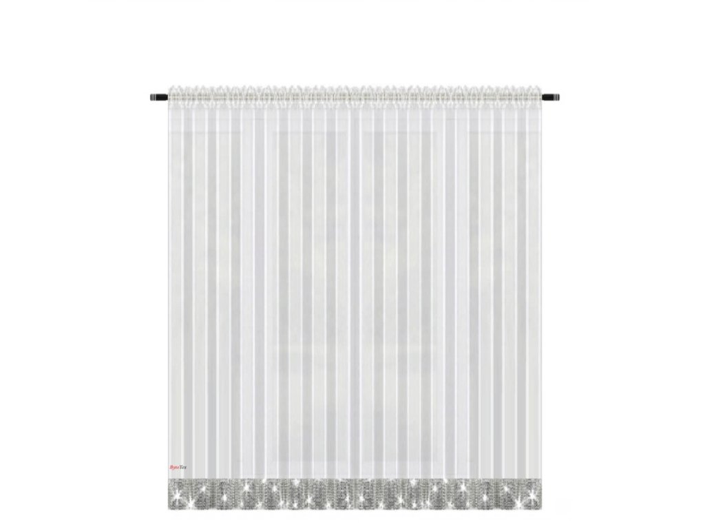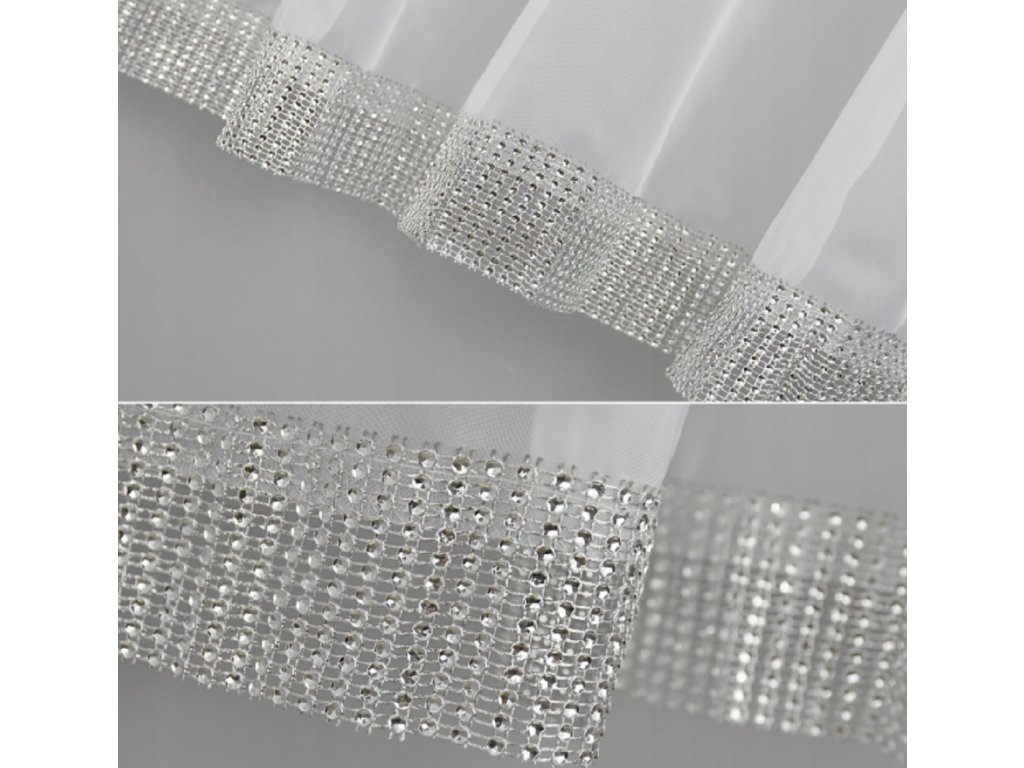 Hotová kusová záclona z hladkého průsvitného bílého voálu. Záclona je zdobená ve spodní části krásnýmí imitovanými zirkony 6 cm. Nahoře je opatřena řasící stuhou díky které můžete měnit šířku záclony a tunýlkem na tyč o průměru 3,5 cm. Je též přizpůsobena k pověšení na háčky nebo žabky. Dá se nařasit.
