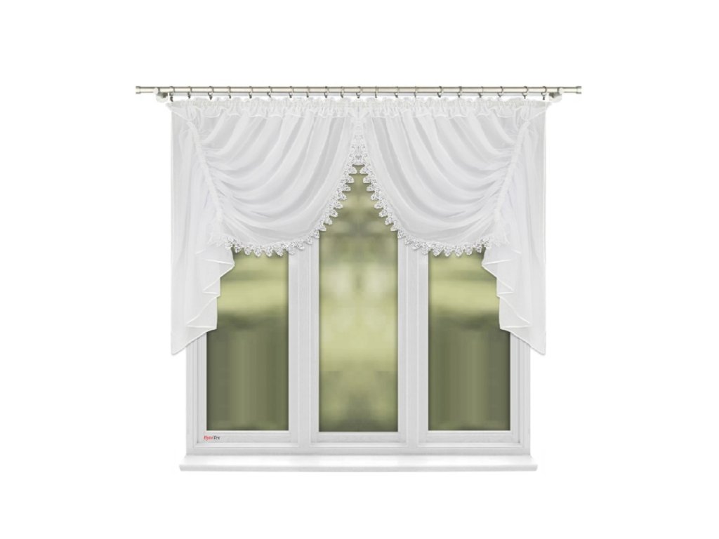 Hotová kusová záclona z hladkého průsvitného bílého voálu je ozdobená krásnou krajkou. Nahoře je opatřena řasící stuhou díky které můžete měnit šířku záclony a tunýlkem na tyč o průměru 3,5 cm. Je též přizpůsobena k pověšení na háčky nebo žabky.