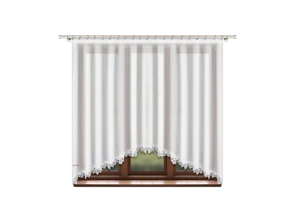 Hotová kusová záclona z hladkého průsvitného bílého voálu je ozdobená krásnou krajkou. Nahoře je opatřena řasící stuhou díky které můžete měnit šířku záclony a tunýlkem na tyč o průměru 3,5 cm. Je též přizpůsobena k pověšení na háčky nebo žabky. Dá se nařasit.