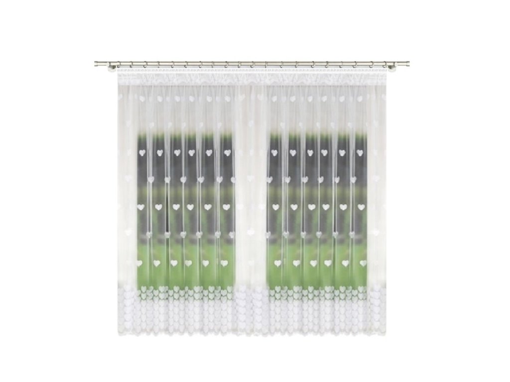 Hotová vyšívaná záclona Lovetta - je perfektní model k zavěšení na jakékoli okno. Záclona je zdoben vyšívanými srdíčky, což dodává romantiku. Nahoře je opatřena řasící stuhou díky které můžete měnit šířku záclony a tunýlkem na tyč o průměru 3,5 cm. Je též přizpůsobena k pověšení na háčky nebo žabky.