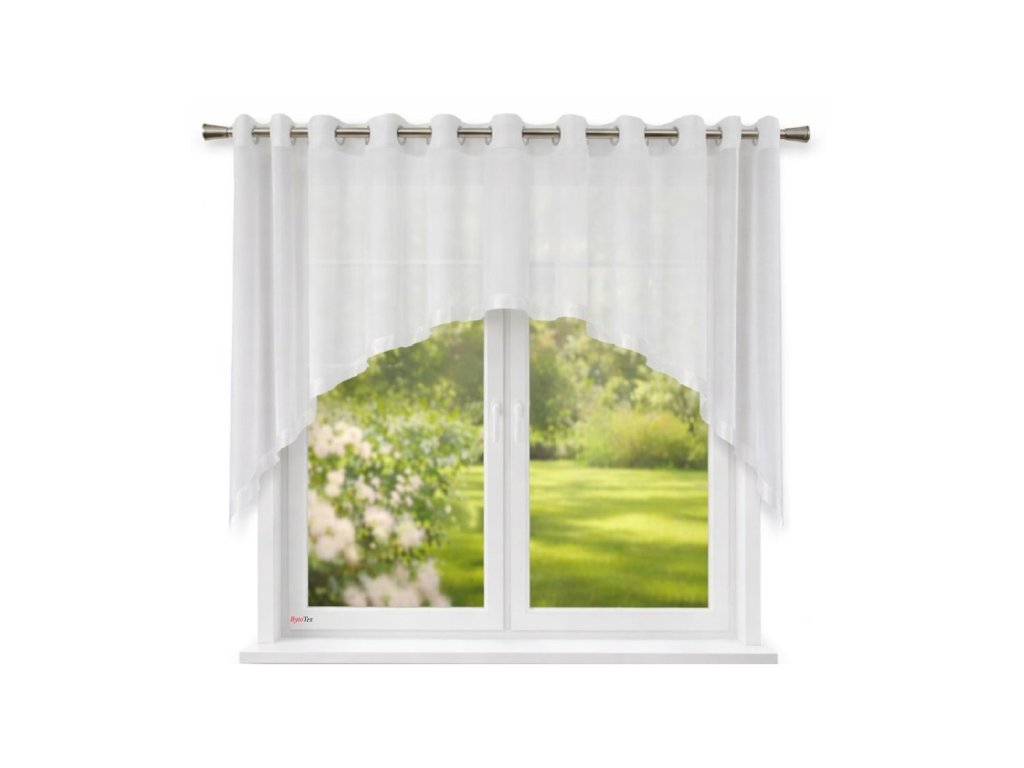 Hotová kusová záclona z hladkého průsvitného bílého voálu. Záclona je zdobená ve spodní části saténovou stuhou širokou 4 cm. Tato krátká bílá voálová záclona je ideální jak do kuchyně, tak do ložnice.