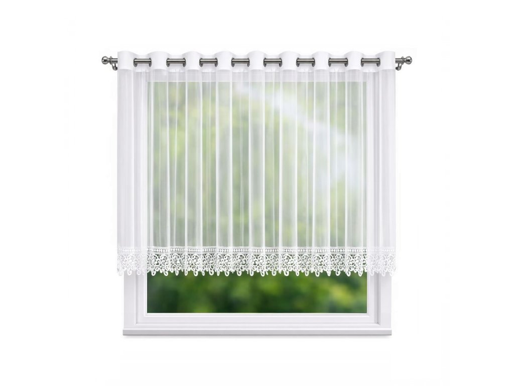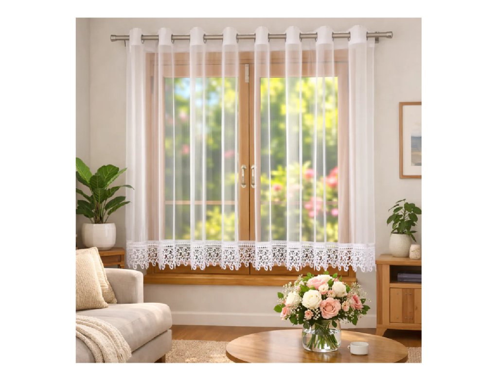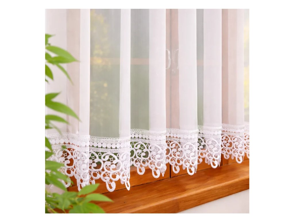 Bílá voálová záclona Nani je volba pro ty, kteří mají rádi jemnou eleganci. Lehký, poloprůhledný materiál propouští měkké světlo, přední stranu zdobí drobné třpytivé kamínky a dole dekorativní krajka, která zvýrazňuje její klasický charakter.