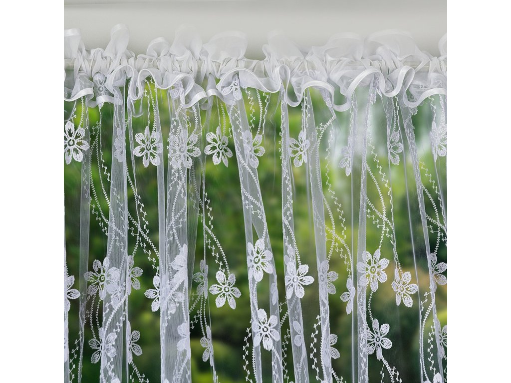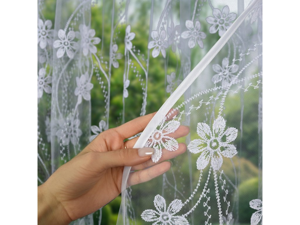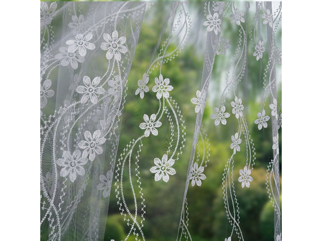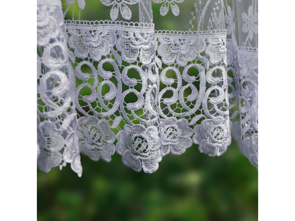 Kvalitní hotová voálová záclona zdobená krajkou a imitací zirkonů v rozměru 400x160 cm. Záclona má našitou řasící pásku s tunýlkem pro zavěšení na tyč o průměru 3,5 cm, žabky nebo háčky, má jemné lemování.