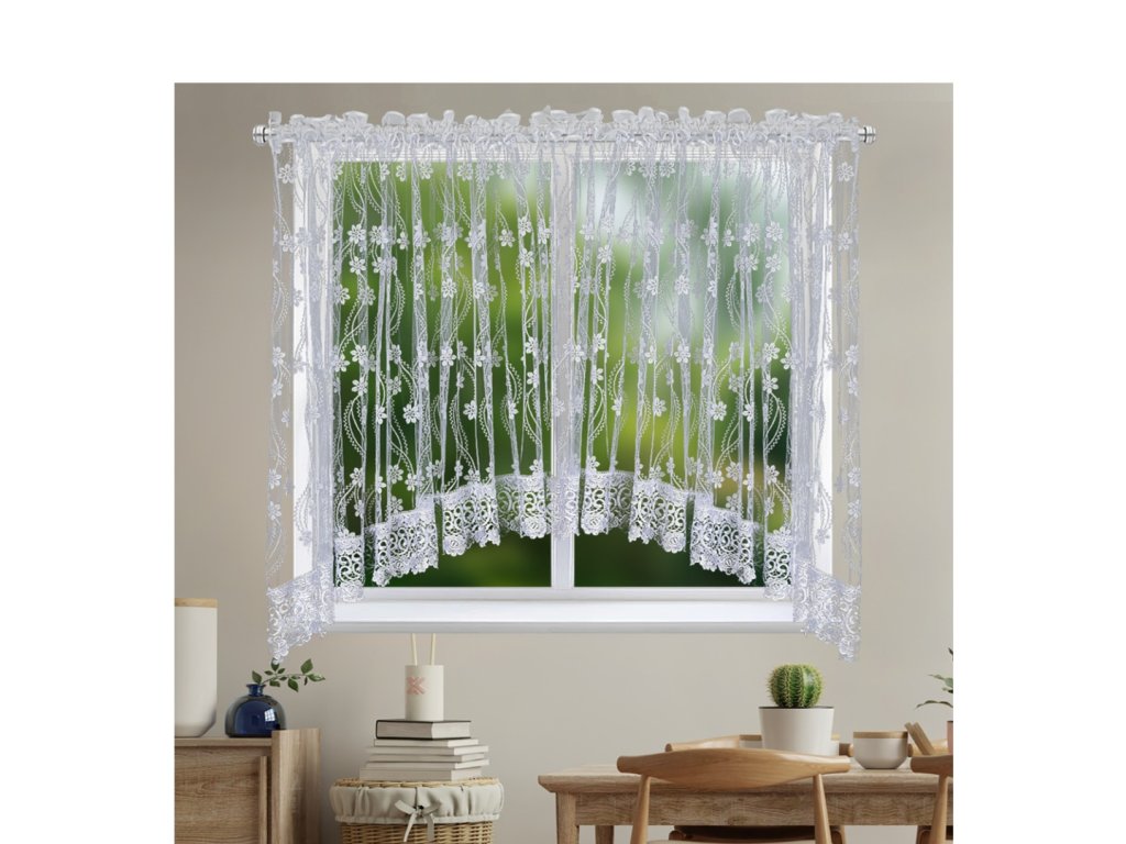 Šíře záclony je 300 cm a výška 140 cm. Dá se nařasit. Rozměry jsou uvedeny v nenařaseném stavu, výška záclony je měřena v nejdelším místě. Krajka ne vždy odpovídá...