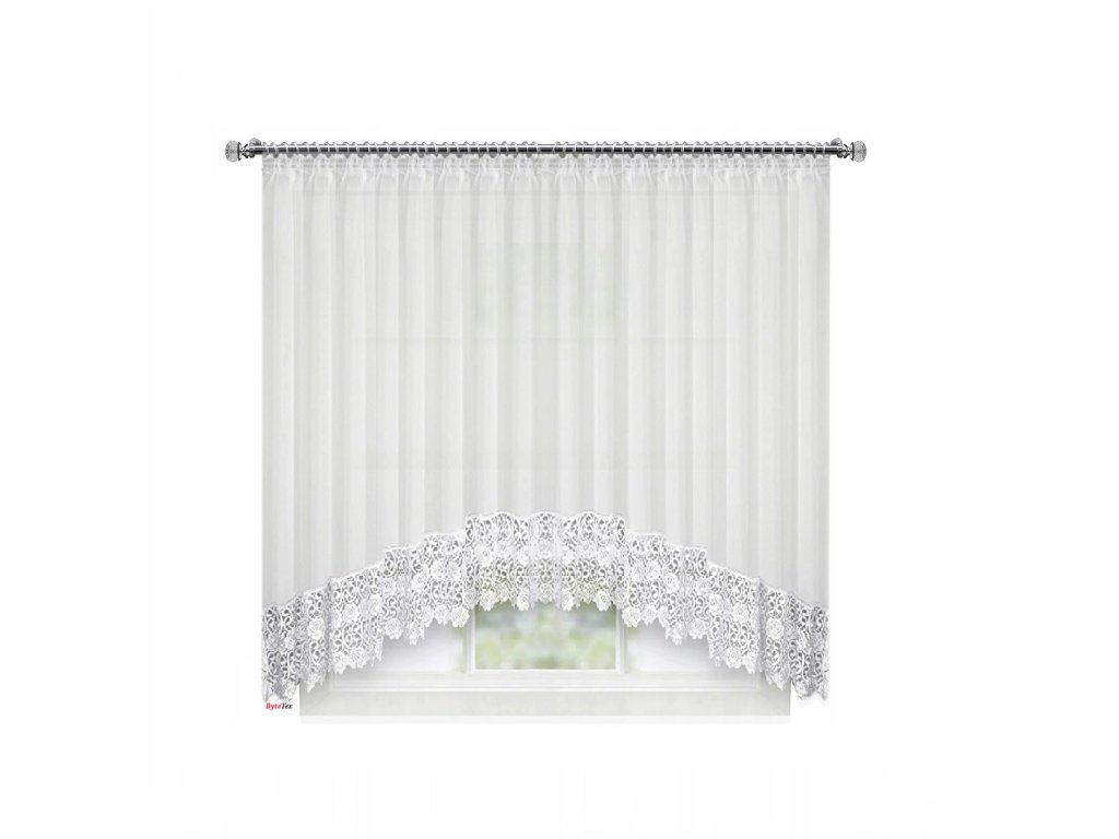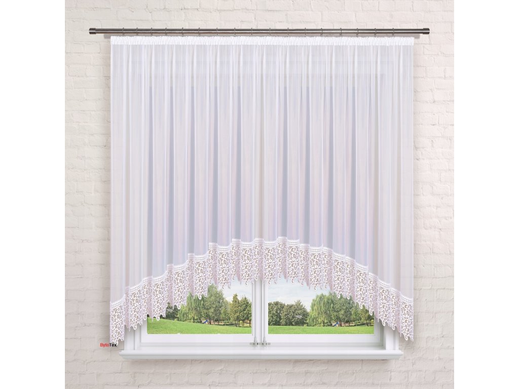 Hotová kusová záclona z hladkého průsvitného bílého voálu je ozdobená krásnou krajkou (12 cm). Nahoře je opatřena řasící stuhou díky které můžete měnit šířku záclony a tunýlkem na tyč o průměru 3,5 cm. Je též přizpůsobena k pověšení na háčky nebo žabky. Dá se nařasit.