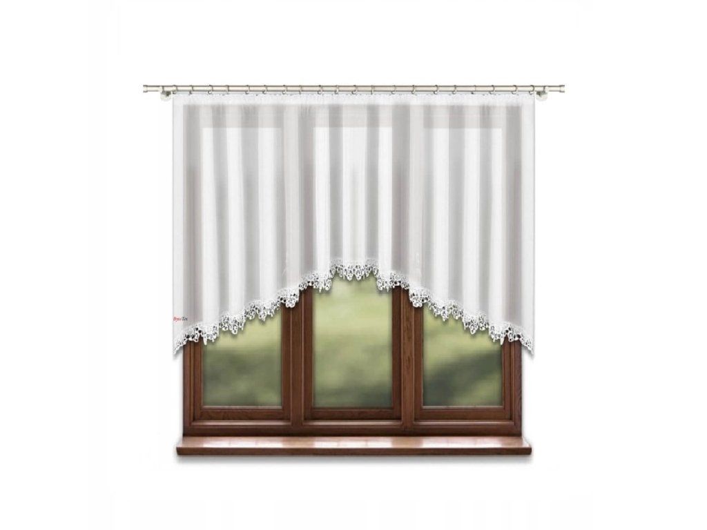 Hotová kusová záclona z hladkého průsvitného bílého voálu je ozdobená krásnou krajkou. Nahoře je opatřena řasící stuhou díky které můžete měnit šířku záclony a tunýlkem na tyč o průměru 3,5 cm. Je též přizpůsobena k pověšení na háčky nebo žabky. Dá se nařasit.