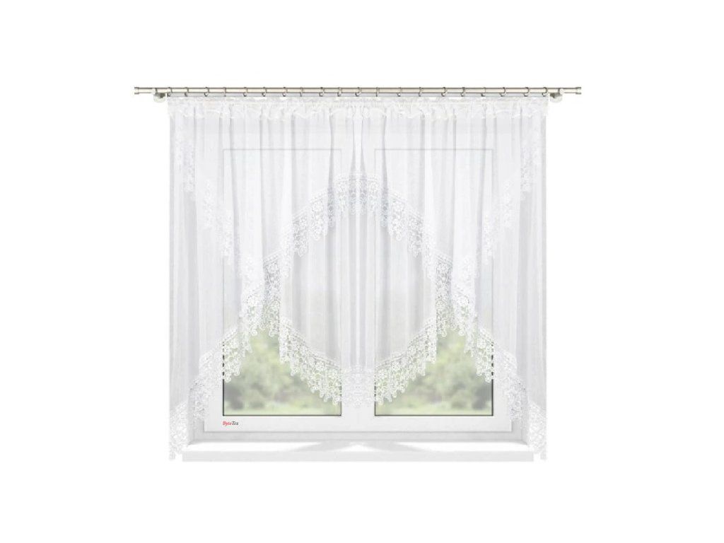 Hotová kusová záclona z hladkého průsvitného bílého voálu je ozdobená krásnou krajkou. Nahoře je opatřena řasící stuhou díky které můžete měnit šířku záclony a tunýlkem na tyč o průměru 3,5 cm. Šíře záclony je 400 cm a výška 150 cm dá se nařasit.