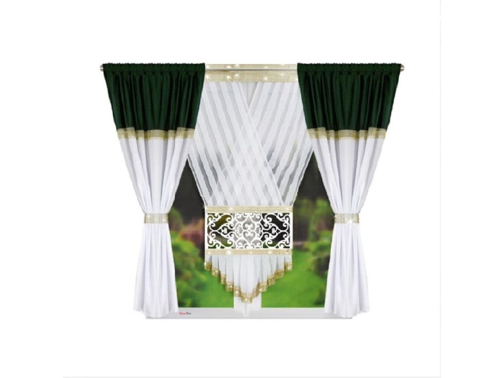 Sada závěsů s panelem Dezzi je nejen zajímavou barevnou kombinací. Zde máme zelenou látku s květinovým vzorem, která zdůrazňuje jedinečný vzhled záclon. V horní části závěsu je vložka z zelené látky, zdobená kubickou zirkonií. Taková vložka dělá jednoduchou sadu závěsů modernější a dokonce i trochu extravagantní. Celá sada na pásce má rozměr 310 × 160 cm a lze ji zavěsit na různé typy záclonové tyče.Sada obsahuje dva závěsy a jeden panel pro úhledný celek.