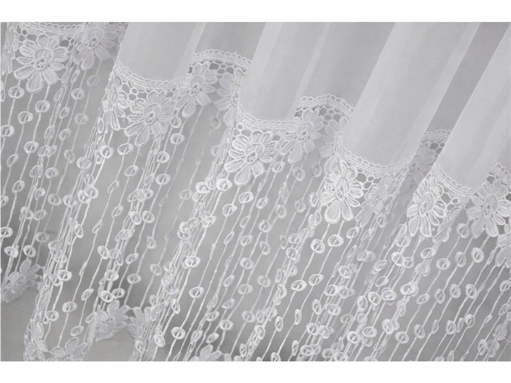 Hotová kusová záclona z hladkého průsvitného bílého voálu je ozdobená krásnou krajkou (40 cm). Nahoře je opatřena řasící stuhou díky které můžete měnit šířku záclony a tunýlkem na tyč o průměru 3,5 cm. Šíře záclony je 400 cm a výška 250 cm. Dá se nařasit.