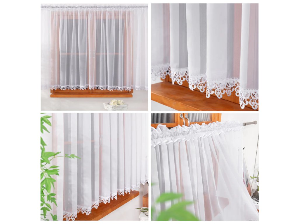 Hotová kusová záclona z hladkého průsvitného bílého voálu je ozdobená krásnou krajkou. Nahoře je opatřena řasící stuhou díky které můžete měnit šířku záclony a tunýlkem na tyč o průměru 3,5 cm. Je též přizpůsobena k pověšení na háčky nebo žabky. Dá se nařasit.