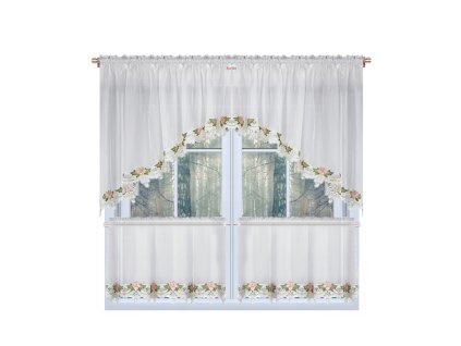 Tento elegantní set se skládá z 3 částí. Tento set efektně ozdobí okno v kuchyni, ložnici, jídelně nebo dětském pokoji. Vytvoří útulný a nadčasový design, oživí prostor v jakémkoliv stylu. Bílý voál rozjasní místnost a vnese do interiéru teplou energii.