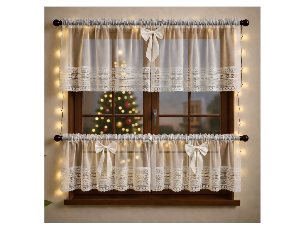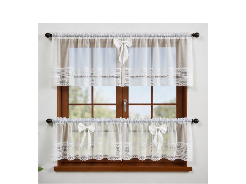Tento elegantní set se skládá z 3 částí. Tento set efektně ozdobí okno v kuchyni, ložnici, jídelně nebo dětském pokoji. Vytvoří útulný a nadčasový design, oživí prostor v jakémkoliv stylu. Bílý voál rozjasní místnost a vnese do interiéru teplou energii.