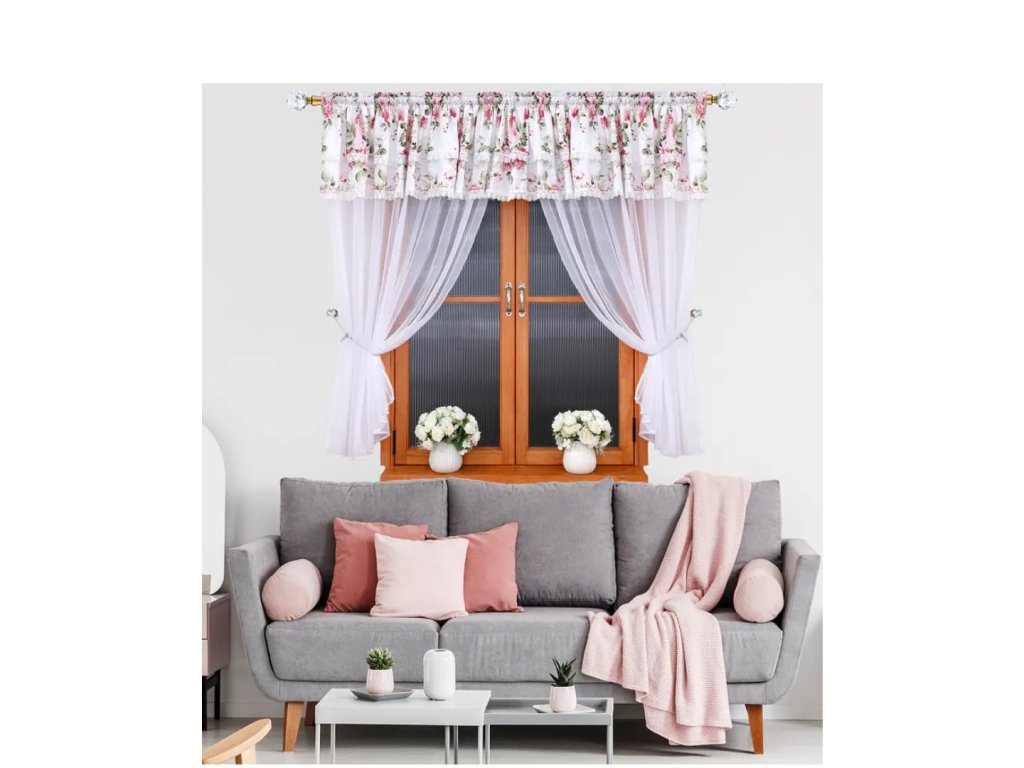 Hotová kusová záclona z hladkého průsvitného bílého voálu s krásným a kvalitním saténovým zdobením. Nahoře je opatřena řasící stuhou díky které můžete měnit šířku záclony a Sada hotových záclon Verena je jemná, romantická záclona z poloprůhledné látky, která krásně propouští světlo a zútulní interiér. Horní část zdobí květinový lambrekin se dvěma řadami krajky, boky lze stáhnout přiloženými páskami.