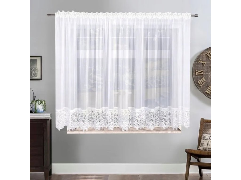 Hotová kusová záclona z hladkého průsvitného bílého voálu je ozdobená krásnou krajkou. Nahoře je opatřena řasící stuhou díky které můžete měnit šířku záclony a tunýlkem na tyč o průměru 3,5 cm. Je též přizpůsobena k pověšení na háčky nebo žabky.