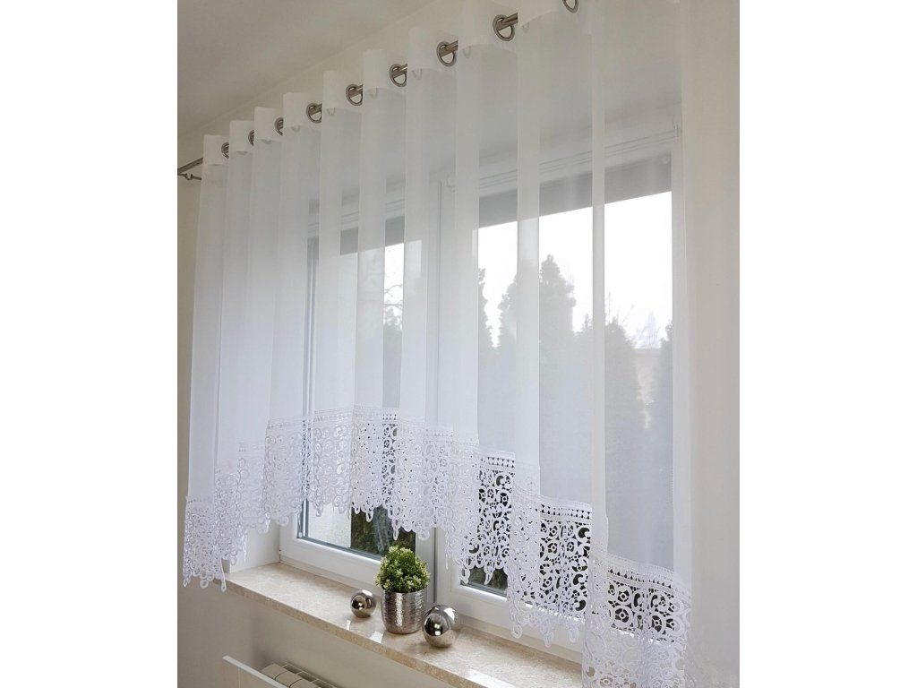 Bílá voálová záclona Nani je volba pro ty, kteří mají rádi jemnou eleganci. Lehký, poloprůhledný materiál propouští měkké světlo, přední stranu zdobí drobné třpytivé kamínky a dole dekorativní krajka, která zvýrazňuje její klasický charakter.