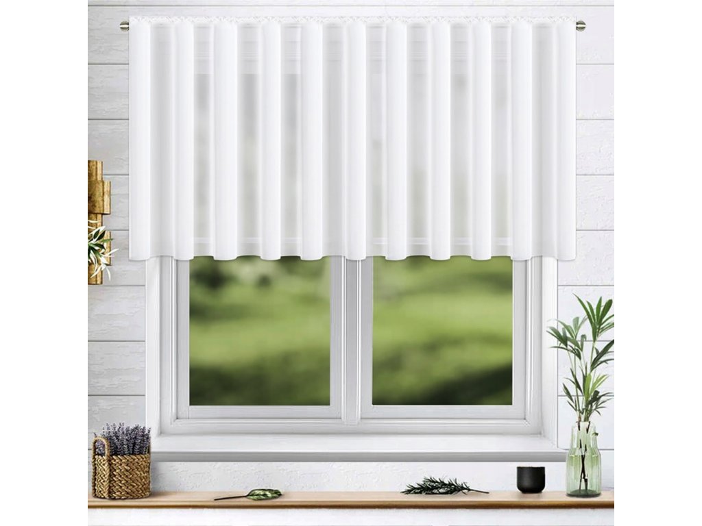 Šíře záclony je 400 cm a výška 110 cm. Dá se nařasit. Rozměry jsou uvedeny v nenařaseném stavu, výška záclony je měřena v nejdelším místě.